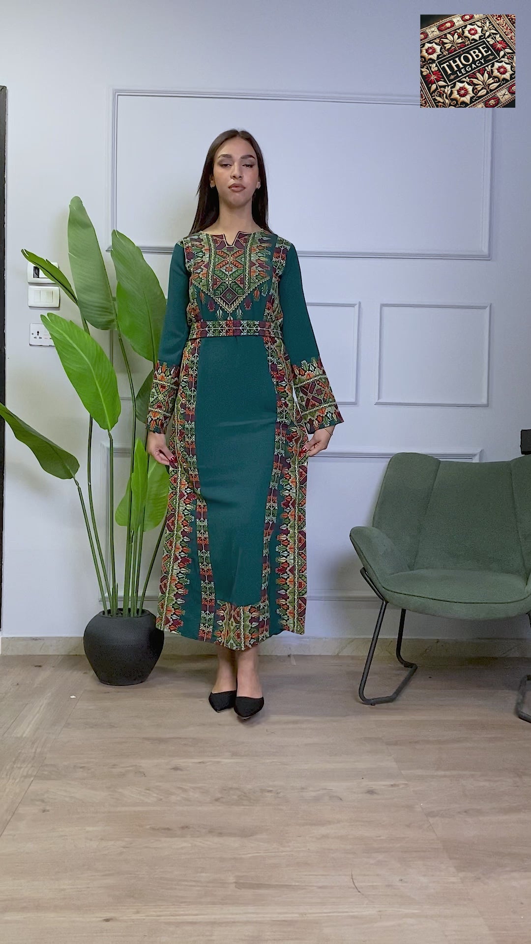 The Stitch Heritage Thobe is a refined expression of cultural craftsmanship and timeless elegance. Designed in a rich deep-teal base, this piece features intricate tatreez-inspired embroidery arranged in striking cross and geometric motifs across the bodice, sleeves, and side panels. The detailed patterns create a beautiful balance of structure and movement while celebrating the artistry of traditional heritage embroidery.