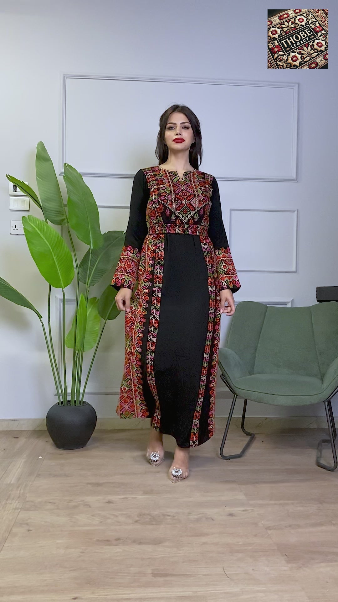 The embroidered waist panel defines the silhouette, while the vertical side panels elongate the design for a graceful, flattering look. Finished with statement embroidered sleeves and a flowing skirt, this thobe blends traditional storytelling motifs with modern sophistication.
